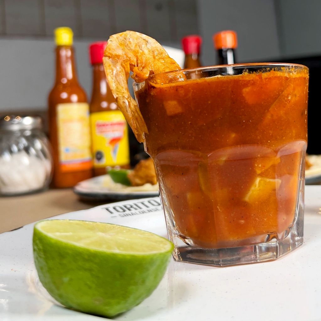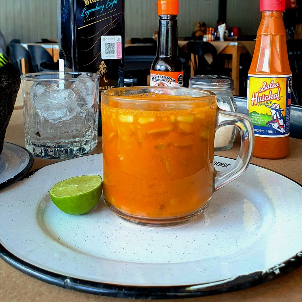 Caldo de camarón + camarón recién cocido + pepino picado + apio picado + cebolla morada finamente picada + limón. 65